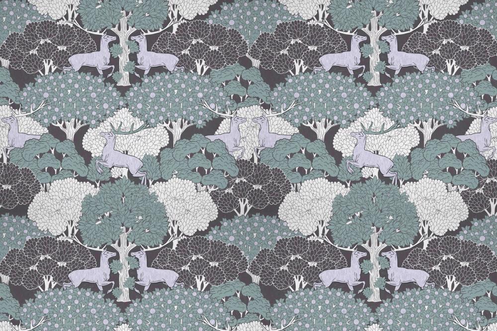 Verspielte Hirsche mit lavendelfarbenem Fell und stolzen Geweihen stehen sich in einem symmetrischen Muster gegenüber. Umgeben von detaillierten Bäumen mit üppigem Laub in Seegrün, Weiß und Dunkelgrau entsteht ein zauberhafter, ruhiger Gesamteindruck. Kleine Früchte oder Blüten setzen verspielte Akzente zwischen den Ästen. Der dunkle Hintergrund lässt die helleren Farben lebendig wirken und schafft Tiefe. Diese Tapete passt perfekt in Wohn- oder Kinderzimmer, Flure oder kreative Arbeitsbereiche. Ideal für alle, die natürliche Motive und ein fantasievolles, künstlerisches Ambiente lieben.