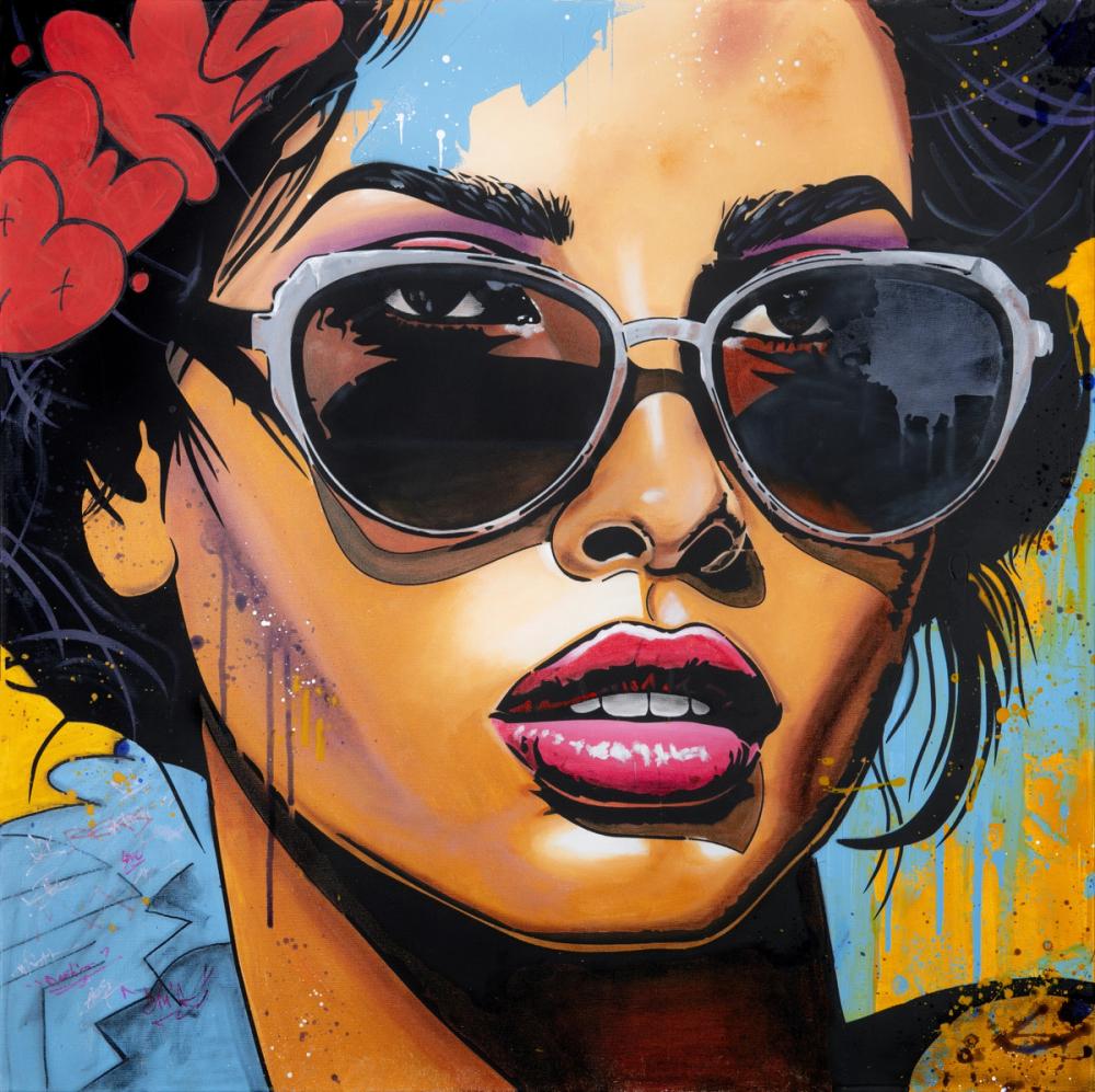 Ein farbenfrohes Graffiti-Porträt einer Frau mit auffälligen, spiegelnden Sonnenbrillen bringt urbanen Stil direkt an Ihre Wand. Ihre leuchtend pinken Lippen und die warm getönten Hautfarben stehen in spannendem Kontrast zu den kräftigen Farbspritzern in Blau, Gelb und Orange im Hintergrund. Schwarzes Haar umrahmt ihr Gesicht, während rote Graffiti-Schrift im oberen Bereich ein klares Statement setzt. Diese Wandtapete ist ideal für Wohnzimmer, Jugendzimmer, Kreativräume oder Flure. Mit ihren intensiven Farben und dem verspielten, künstlerischen Look schafft sie eine jugendliche, ausdrucksstarke Atmosphäre.