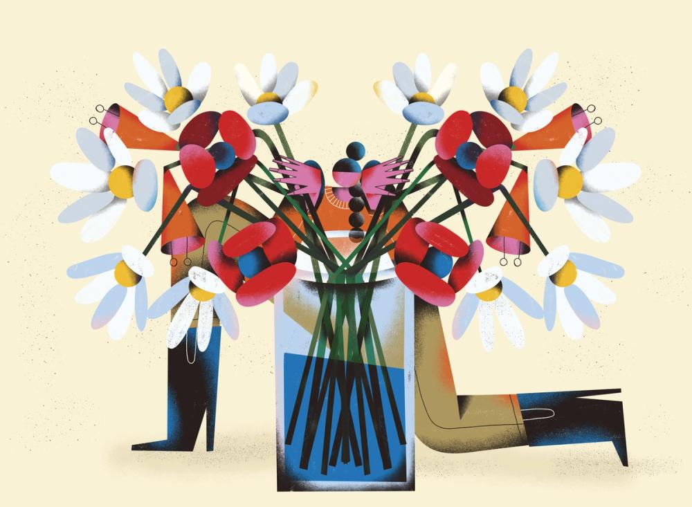 Ein stilisierter Blumenstrauß mit weißen Gänseblümchen, roten Mohnblumen und grünen Stielen steht in einer transparenten blauen Vase – doch hier steckt mehr dahinter. Zwischen den Blüten tauchen pinkfarbene Hände und Beine in Stiefeln auf, die dem Motiv eine verspielte, fast menschliche Note verleihen. Der helle beigefarbene Hintergrund bringt die kräftigen Farben zum Leuchten. Dieses künstlerische Wandbild mit seinem fröhlichen und fantasievollen Charakter passt ideal in Wohnzimmer, Kinderzimmer, Flure oder kreative Arbeitsbereiche. Die Kombination aus Rot-, Grün- und Blautönen sorgt für einen lebendigen, auffälligen Look mit einem Hauch Humor.