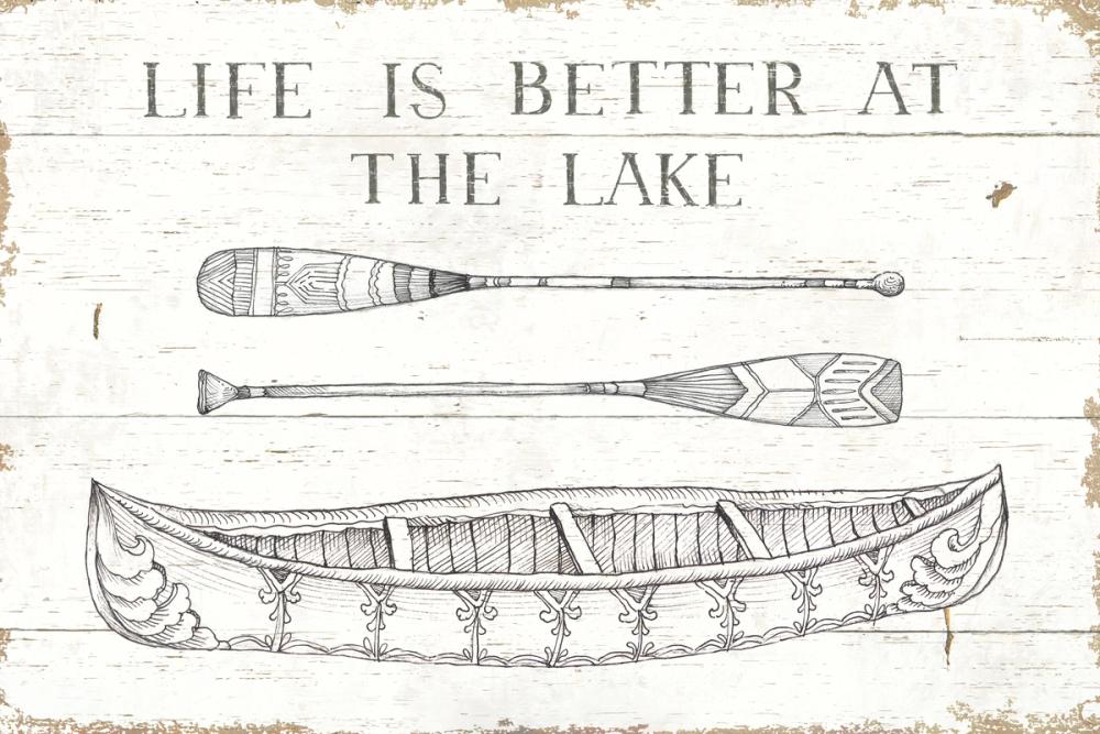 Deze rustieke muurdecoratie toont een vintage illustratie van een kano en twee peddels met sierlijke patronen, geplaatst op een witgewassen houten achtergrond. De tekst "LIFE IS BETTER AT THE LAKE" springt eruit in een klassieke serif-letter. De verweerde randen geven het geheel een warme, nostalgische uitstraling. Perfect voor wie houdt van een rustige, uitnodigende sfeer in huis. Ideaal voor de woonkamer, gang, slaapkamer of een vakantiehuisje. De neutrale kleuren zoals wit en crème maken het makkelijk te combineren met andere tinten in je interieur. Deze wanddecoratie brengt een vredige en landelijke charme in elke ruimte.