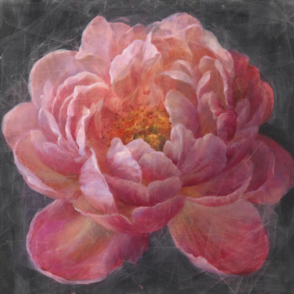 Een grote, gedetailleerde pioenroos in roze en perzik vult dit behang volledig, met zachte, bijna doorschijnende bloemblaadjes die subtiele witte accenten dragen. Het hart van de bloem toont warme tinten geel en oranje, wat extra diepte geeft aan het ontwerp. De donkere, krijtachtige achtergrond zorgt voor een krachtig contrast en laat de levendige kleuren nog intenser uitkomen. Dit bloemmotief straalt een dromerige, artistieke sfeer uit en past perfect in ruimtes zoals de slaapkamer, woonkamer of studeerkamer. De warme roze tinten geven elke muur een verfijnde en moody uitstraling.
