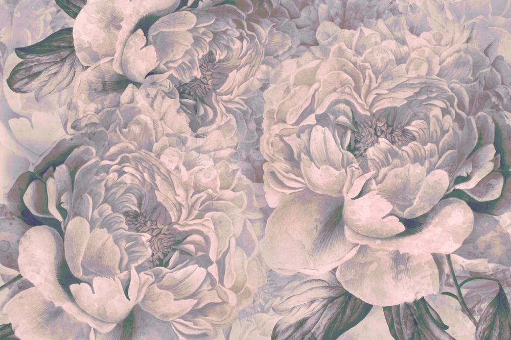 Een dromerig bloemenpatroon met grote pioenen in zachte pasteltinten van roze en beige vult deze wand met rust en romantiek. De bloemblaadjes zijn fijn getekend, met subtiele schaduwen en een gelaagde textuur die een artistieke uitstraling geeft. Tussen de bloemen zorgen groene bladeren voor een mooi kleurcontrast. Deze muurprint past perfect in ruimtes zoals de slaapkamer, woonkamer of hal, waar een kalme en serene sfeer gewenst is. De zachte kleuren – blush roze, pasteltinten en lichtgroen – maken het ideaal voor een dromerige, rustige inrichting. Een perfecte keuze voor wie houdt van een vintage en kunstzinnige stijl.