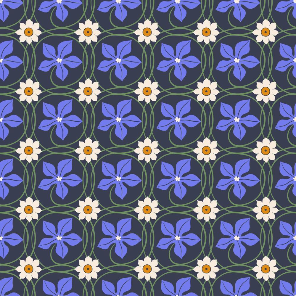 Een vrolijk bloemenpatroon met lichtblauwe bloemen met vijf bloemblaadjes en witte kern, afgewisseld met witte bloemen met een oranje hart. Donkergroene lijnen vormen sierlijke kronkels die alles met elkaar verbinden op een donkere achtergrond. De symmetrische indeling geeft het ontwerp een rustige en speelse uitstraling. De kleurencombinatie van korenbloemblauw, wit, oranje en donkergroen zorgt voor een pastelachtig, fris effect. Perfect voor kinderkamers, woonkamers of creatieve werkplekken waar je een speelse en opgewekte sfeer wilt creëren. Het past goed bij een vrolijke, fantasierijke stijl.
