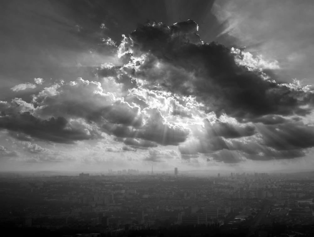 Ein eindrucksvolles Stadtpanorama in Schwarz-Weiß zeigt Paris unter einer dramatischen Wolkendecke. Sonnenstrahlen brechen durch die dichten Wolken und werfen lebendige Lichtkegel auf die Dächer der Stadt. Die Mischung aus Licht und Schatten verleiht dem Motiv eine geheimnisvolle, nachdenkliche Stimmung. Ideal für Wohnzimmer, Schlafzimmer, Büro oder Flur. Die dunklen Grautöne und das Spiel mit Kontrasten machen diese Wandtapete zu einer starken Wahl für alle, die eine stimmungsvolle und urbane Atmosphäre schaffen möchten. Besonders passend für moderne Räume mit klaren Linien und reduzierter Farbpalette.