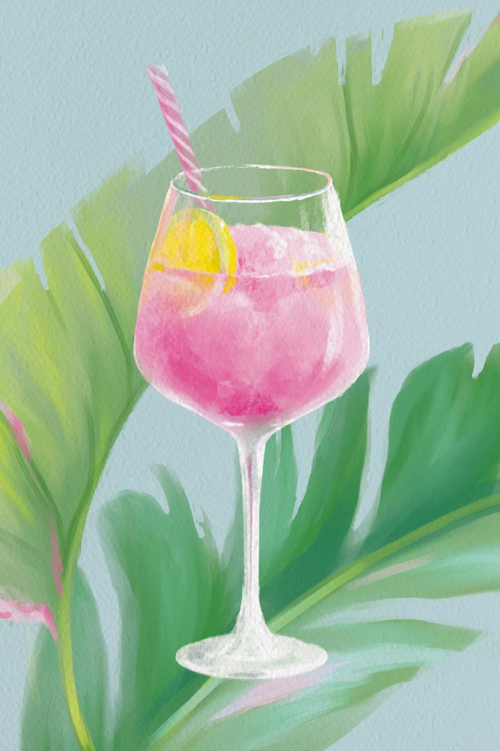 Ein pastellfarbener Cocktail mit Zitronenscheibe und pink-weißem Strohhalm steht im Mittelpunkt dieses frischen Wandmotivs. Das Glas mit zartrosa Inhalt wirkt durch seinen dünnen Stiel elegant und verspielt. Im Hintergrund sorgen große grüne Blätter und ein hellblauer Himmel für ein tropisches, lebendiges Ambiente. Die gemalte Textur verleiht dem Motiv eine sanfte, künstlerische Note. Ideal für Küche, Esszimmer, Wohnzimmer oder kreative Cafés. Die Farben Rosa, Grün und Hellblau schaffen eine fröhliche und belebende Stimmung – perfekt für alle, die eine verspielte und frische Raumgestaltung suchen.