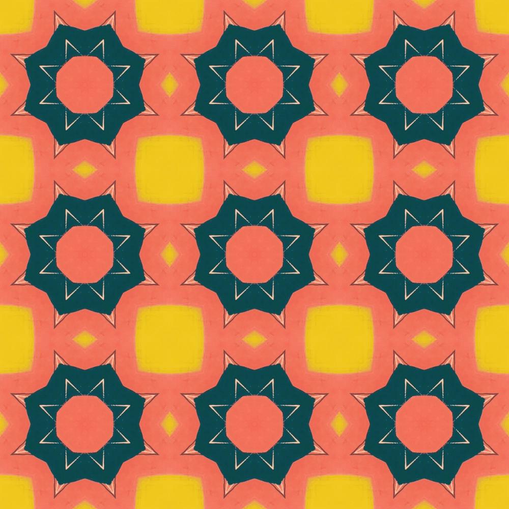 Ein lebendiges, nahtloses Muster mit geometrischen Sternformen – jeder Stern hat einen dunkelgrünen Rand und ein kräftig oranges Zentrum. Der Hintergrund wechselt zwischen gelben und orangenen Quadraten und Rauten ab, was einen kaleidoskopischen Effekt erzeugt. Die klaren Kanten und die flache, glatte Textur betonen die leuchtenden Farben. Diese Tapete passt besonders gut in Kinderzimmer, Spielzimmer, kreative Arbeitsräume oder Flure. Die fröhliche und verspielte Stimmung bringt Energie in jeden Raum. Ideal für alle, die eine auffällige Wandgestaltung mit kräftigen Farben wie Orange, Koralle und Gelb suchen.