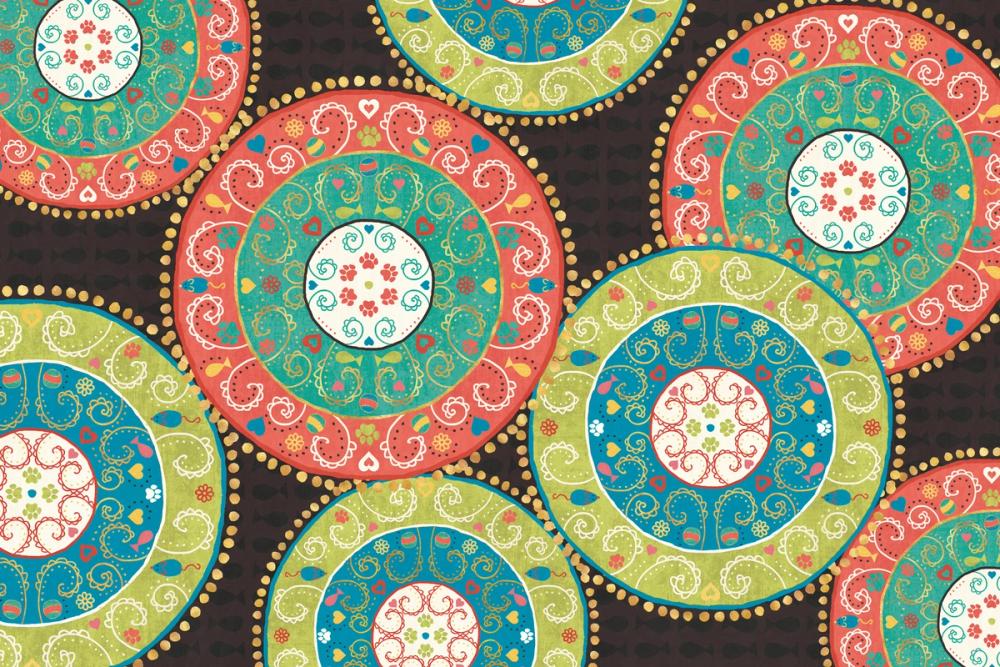 Vibrant circular shapes in red, green, blue, and white dance across a dark background in this playful design. Each circle is filled with detailed floral and paisley patterns, while outer rings feature hearts and dots in yellow, red, and blue. A white center with delicate swirls brings balance to the busy composition. With its cheerful and whimsical mood, this wallpaper suits creative spaces like children's rooms, playrooms, or a fun kitchen corner. The popping colours and decorative symmetry add an artistic touch that draws the eye and brings energy to any wall.