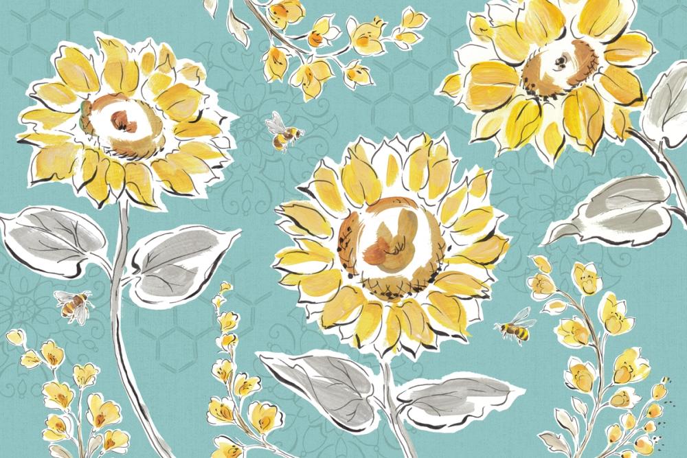 Grandes girasoles amarillos con centros blancos y marrones se destacan sobre un fondo azul claro, acompañados por hojas grises y pequeñas abejas revoloteando. Detalles como flores más pequeñas y patrones sutiles de panal y motivos florales completan esta ilustración de estilo dibujado a mano. Con un aire alegre, juguetón y lleno de fantasía, este papel pintado es ideal para dormitorios infantiles, salas de juegos, pasillos o cualquier espacio donde quieras añadir un toque divertido y luminoso. Los tonos girasol y azul claro aportan calidez y frescura a la decoración.