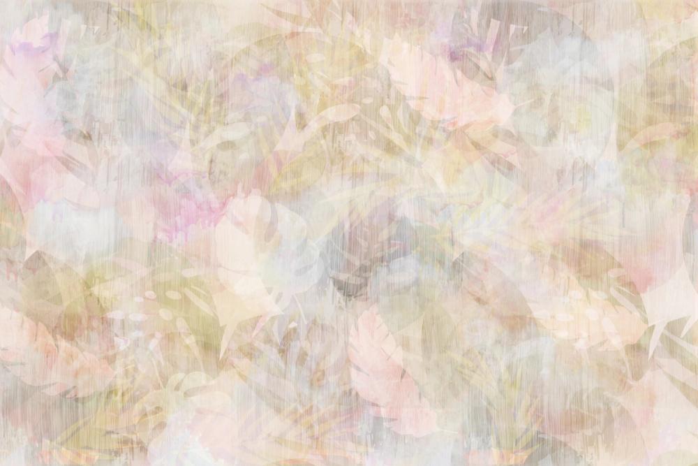 Una escena abstracta en tonos pastel muestra hojas superpuestas con formas variadas, creando una sensación de profundidad suave y envolvente. Los colores rosa, beige, verde claro y toques de lila y azul forman una paleta tranquila, con un efecto tipo acuarela que aporta ligereza y calma. Ideal para dormitorios, salones o zonas de descanso, este papel pintado transmite un ambiente sereno y onírico. Su estilo delicado y aireado encaja perfectamente en espacios que buscan un toque acogedor y relajante. Los colores suaves y el diseño artístico lo convierten en una opción perfecta para quienes buscan una decoración mural con un aire tropical y sutil.