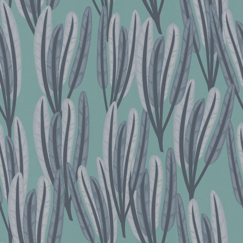 Este mural muestra un patrón repetido de hojas estilizadas sobre un fondo verde azulado. Las hojas, alargadas y dispuestas en grupos simétricos, combinan tonos azulados y blancos con vetas oscuras que aportan contraste y profundidad. Su diseño ordenado y textura suave transmite una sensación de serenidad y armonía. Ideal para salones, dormitorios o espacios de lectura, este papel pintado de estilo tropical y colores fríos es perfecto para crear un ambiente tranquilo y sosegado. Aporta un toque natural y sofisticado sin sobrecargar el espacio, siendo una opción versátil para quienes buscan calma visual en su decoración.