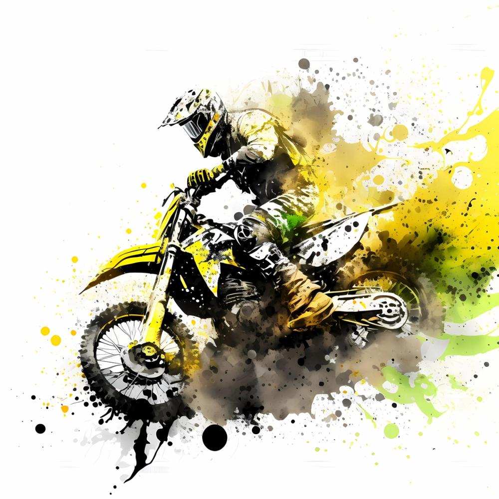 Un motocross en pleine action jaillit de la scène, capturé dans une illustration vibrante aux éclaboussures de jaune soleil, noir et vert. Le pilote, casqué et équipé, se penche avec intensité, prêt à franchir tous les obstacles. L'effet de peinture projetée en arrière-plan donne un mouvement puissant et audacieux à l'ensemble, ajoutant une touche artistique et dynamique. Ce papier peint mural convient parfaitement à une chambre d'enfant, un salon ou une salle de jeux. Idéal pour ceux qui aiment l'aventure et les décors expressifs, il transforme vos murs avec des couleurs vives et une ambiance forte.