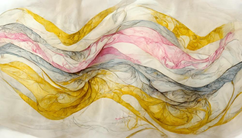 Des lignes ondulées en jaune doux, rose pastel et gris clair s'entrelacent sur un fond blanc crème, créant une œuvre abstraite pleine de mouvement et de légèreté. Les couleurs douces et les textures évoquent un tissu translucide flottant, apportant une sensation de calme et de grâce. Idéal pour les chambres, les salons ou les espaces de détente, ce papier peint mural artistique aux tons pastel instaure une ambiance sereine et rêveuse. Parfait pour ceux qui recherchent une décoration murale esthétique et apaisante dans des tons de tournesol et de crème.