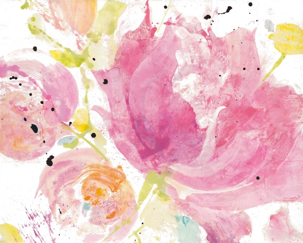 This abstract painting bursts with vibrant color. Imagine pink and peach flowers dancing across your walls, creating a cheerful and dreamy mood. A large central flower, with swirling petals, takes center stage, surrounded by smaller blooms in pink, orange, and yellow. Black splatters and green stems add a striking contrast. Visible brushstrokes give a textured feel to this piece of modern floral art. The soft color blending creates an artistic effect, perfect for adding a whimsical touch to your space. Transform your bedroom, living room, or dining room into a gallery of abstract modern art. This design is equally suited for hotels, cafes, and spas, bringing a touch of nature and abstract vibrant colors to any interior. The watercolor medium adds a unique distinction, making it a captivating focal point.
