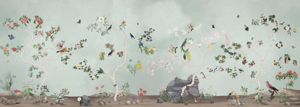 A soft mint green background sets the tone for this calm and serene wall mural. Flowering trees with pink branches bloom in gentle shades of pink, white, yellow, and purple, creating a tranquil garden scene. Birds in red, blue, and brown perch amongst the blossoms, while butterflies and insects bring the artwork to life. Rocks, plants, and small flowers add natural detail to the ground. This dreamy and artistic design suits bedrooms, living rooms, hallways, and reading areas. Its pastel colours and delicate illustrations make it ideal for creating an inviting, peaceful space inspired by nature.