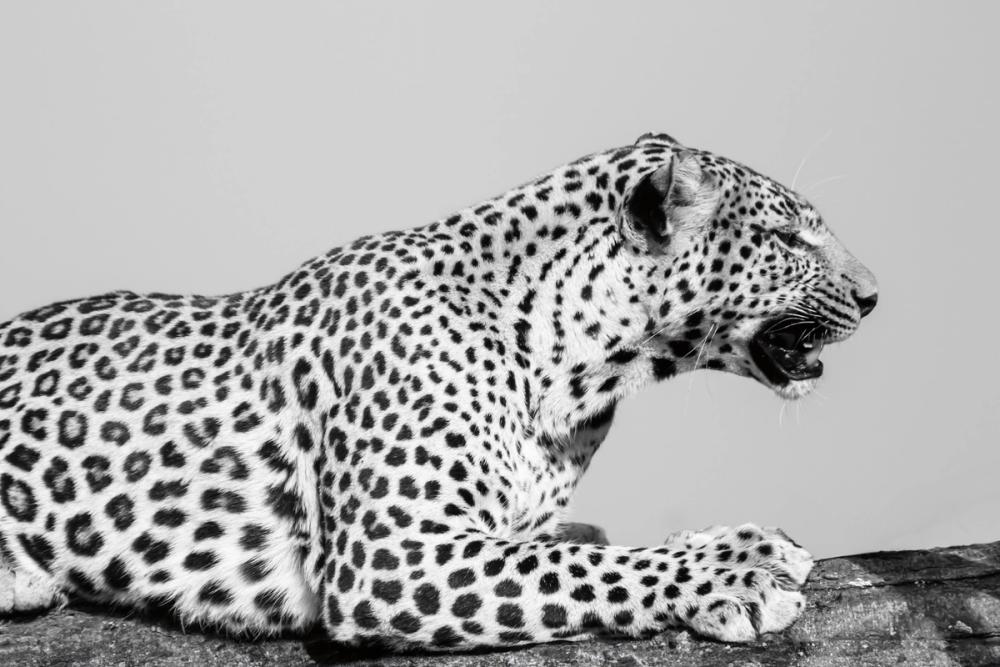 Un'immagine potente in bianco e nero mostra un leopardo disteso su una roccia. La pelliccia chiara è ricoperta da macchie scure ben definite, mentre la bocca aperta e i baffi in evidenza trasmettono forza e tensione. Il contrasto tra la texture liscia del manto e quella ruvida della roccia aggiunge profondità. Lo sfondo neutro esalta il profilo elegante dell'animale. Questo murale dal mood audace e drammatico si adatta perfettamente a soggiorni, camere da letto, uffici e spazi creativi. I toni grigi e neutri rendono questa carta da parati ideale per ambienti moderni che cercano un tocco distintivo e deciso.