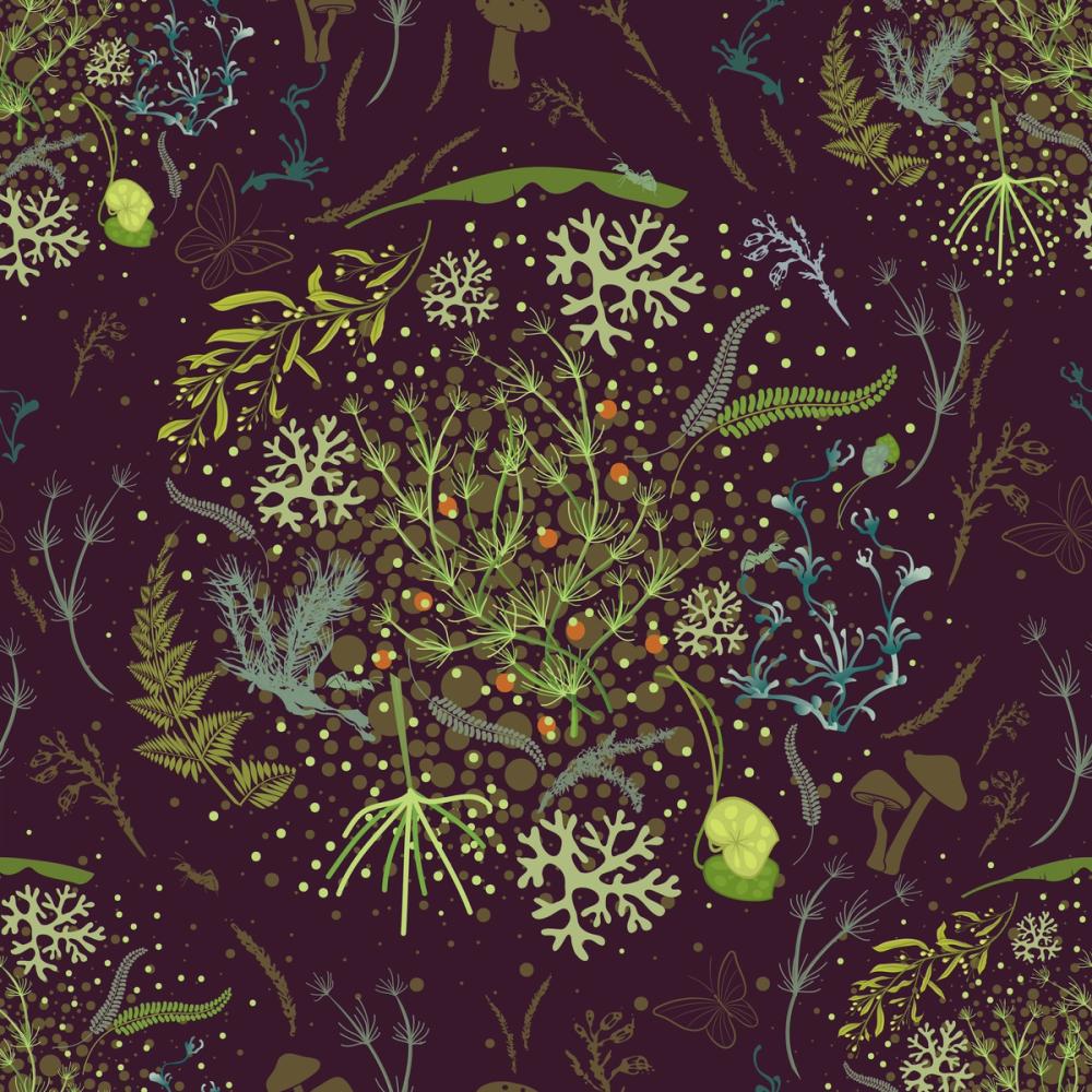 Questo disegno botanico presenta un mix vivace di piante astratte, felci, funghi e strutture che ricordano il corallo, su uno sfondo scuro che fa risaltare i colori. Toni di verde felce, blu e giallo si intrecciano in forme organiche ricche di dettagli, con piccoli elementi punteggiati e delicate sagome di farfalle. Lo stile è artistico e sognante, perfetto per chi cerca una carta da parati fantasiosa e fuori dal comune. Ideale per stanze come soggiorno, camera da letto, studio e camerette, questa carta da parati crea un'atmosfera giocosa e naturale, ispirata al mondo della foresta. I colori terrosi donano calore e profondità a ogni ambiente.