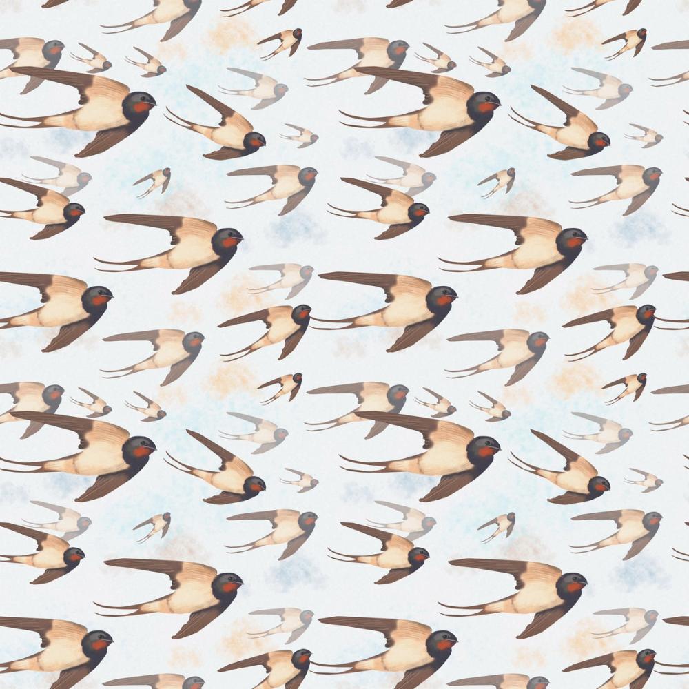 Un disegno delicato di rondini in volo anima questo murale da parete, con uccelli dalle ali marroni, corpi color crema e teste scure con dettagli rossastri. Il fondo chiaro, arricchito da sfumature acquarellate blu e arancio, crea profondità e contrasto, trasmettendo una sensazione di leggerezza. Lo stile artistico e sognante lo rende perfetto per spazi come camere da letto, soggiorni e studi. I toni marroni e chiari si adattano facilmente a diversi arredamenti, portando un tocco tranquillo e poetico alla stanza. Ideale per chi cerca una carta da parati dallo stile vintage e naturale.