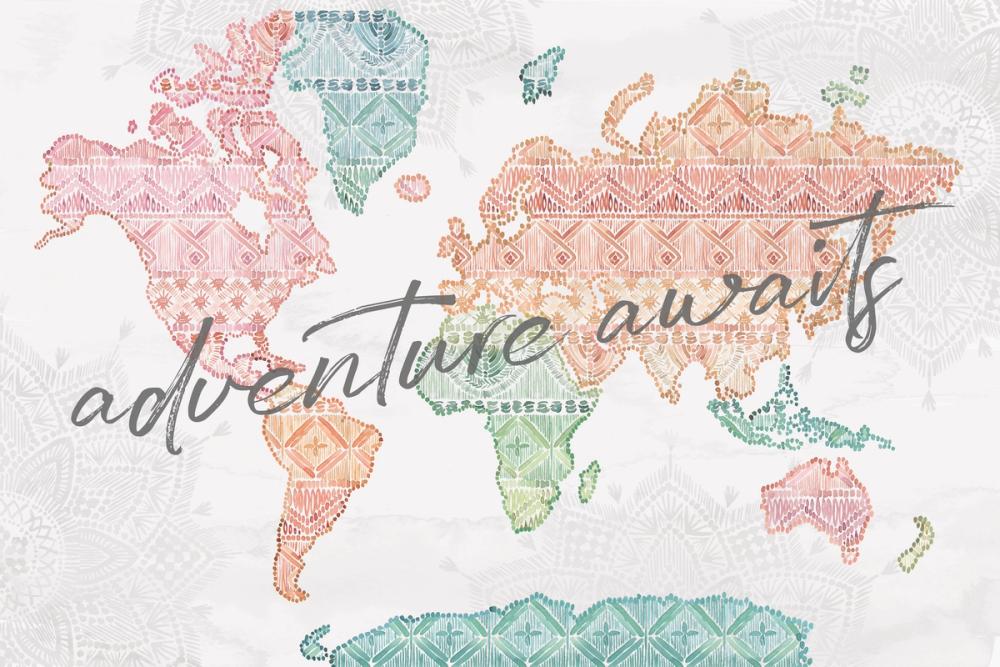 Una mappa del mondo color pastello prende vita con dettagli delicati: l'America del Nord in rosa, il Sud America in arancione, l'Africa in verde, Europa e Asia in arancione, Australia in rosa e l'Antartide in verde acqua. Sul fondo grigio chiaro si intrecciano motivi mandala, che donano un tocco sereno e avvolgente. La scritta "adventure awaits" in corsivo grigio aggiunge un invito alla scoperta. Perfetta per camerette, aule, studi o angoli lettura, questa carta da parati trasmette calma e calore. I toni pastello e lo stile accogliente la rendono ideale per creare un ambiente invitante e tranquillo.
