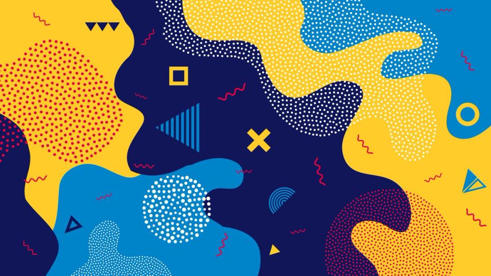A bold and colorful abstract pattern filled with playful energy. This wall mural features yellow, blue, and dark blue backgrounds layered with wavy shapes, vibrant red lines, and scattered white and red dots for a textured look. Geometric elements like circles, triangles, squares, and an "X" create a fun, dynamic layout. Perfect for adding a cheerful and whimsical mood to children's rooms, creative workspaces, playrooms, or any area that needs a pop of personality. The popping colours and lively design make it a standout choice for modern interiors looking for a fresh, 90s-inspired vibe.
