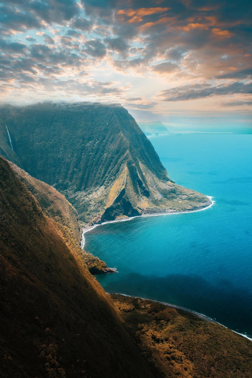 Een adembenemend kustlandschap met steile groene kliffen die uitkomen op een helderblauwe oceaan. Links stort een smalle waterval van de rotsen naar beneden, terwijl de kustlijn zacht glooit en wordt omlijst door weelderige begroeiing. De lucht is betoverend met oranje en roze wolken die zorgen voor een warme, dromerige sfeer. Deze wanddecoratie brengt een gevoel van rust en natuurlijke harmonie in elke ruimte. Perfect voor woonkamers, slaapkamers of thuiskantoren waar je een kalme en serene uitstraling wilt creëren. De combinatie van oceaanblauw, aardetinten en levendig groen maakt het een natuurlijke blikvanger in elk interieur.