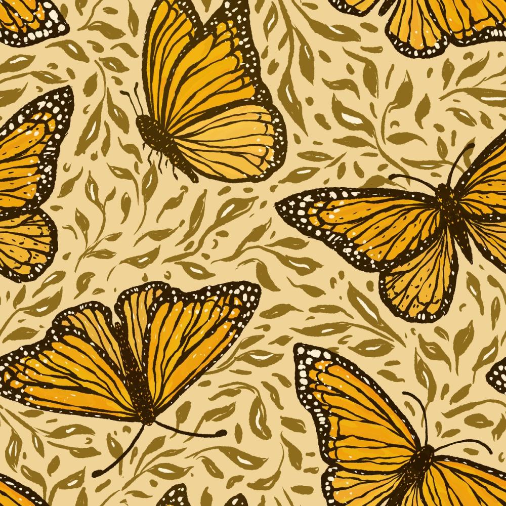 Een speels en artistiek patroon met levendige oranje vlinders, omlijnd in zwart en afgewerkt met witte stippen op hun vleugels. Ze fladderen in verschillende richtingen over een lichtbeige achtergrond met olijfgroene bladeren. De symmetrische opbouw en herhaling van elementen zorgen voor een gevoel van rust en beweging tegelijk. Deze wanddecoratie past perfect in kinderkamers, woonkamers, hallen of creatieve werkplekken. De aardse kleuren zoals saffraan, beige en olijfgroen maken het een warme toevoeging aan elk interieur met een natuurlijke of kleurrijke uitstraling. Een ideale keuze voor wie houdt van een vrolijke en fantasierijke sfeer in huis.