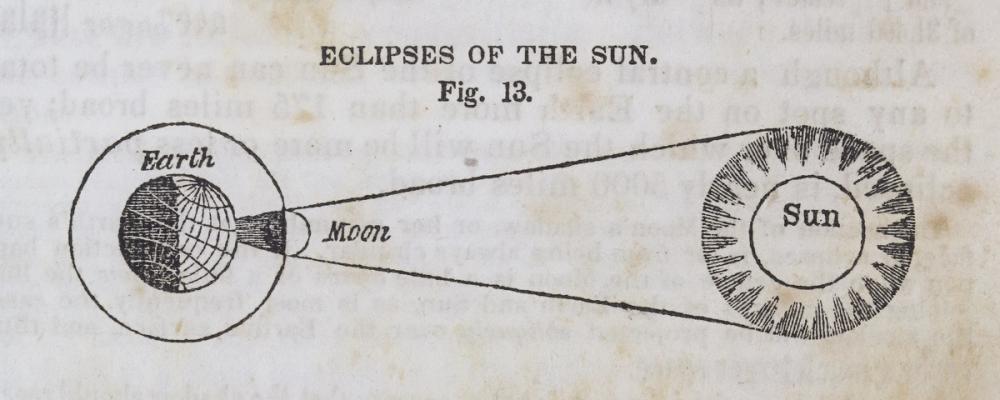 Een oude illustratie toont een zonverduistering in detail, met de Aarde links, de Maan in het midden en de Zon rechts. Duidelijke lijnen geven het pad van de schaduw weer, waardoor dit kunstwerk een boeiende weergave is van hemelmechanica. De neutrale kleuren zoals crème en wit zorgen voor een zachte uitstraling, terwijl de nostalgische en mysterieuze sfeer het ideaal maakt voor ruimtes zoals een studeerkamer, woonkamer of hal. Deze tijdloze en artistieke wanddecoratie spreekt liefhebbers van astronomie en vintage illustraties aan, en brengt een doordachte rust in elke ruimte van je huis.
