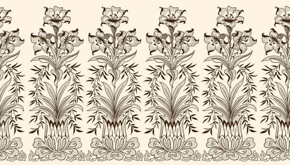 A repeating floral pattern features stylized lilies in decorative vases, with swirling vines, fine petals, and delicate leaves. The symmetrical design, in dark umber brown on a beige background, creates a vintage and artistic atmosphere. This timeless wallpaper adds a refined, bespoke touch to any space. Its earthy tones work well in living rooms, bedrooms, hallways, or reading nooks, bringing warmth and classic charm. Ideal for those who appreciate detailed ornamentation and traditional style, it pairs beautifully with wooden furniture and muted colour schemes. A perfect choice for creating a calm and artistic interior.