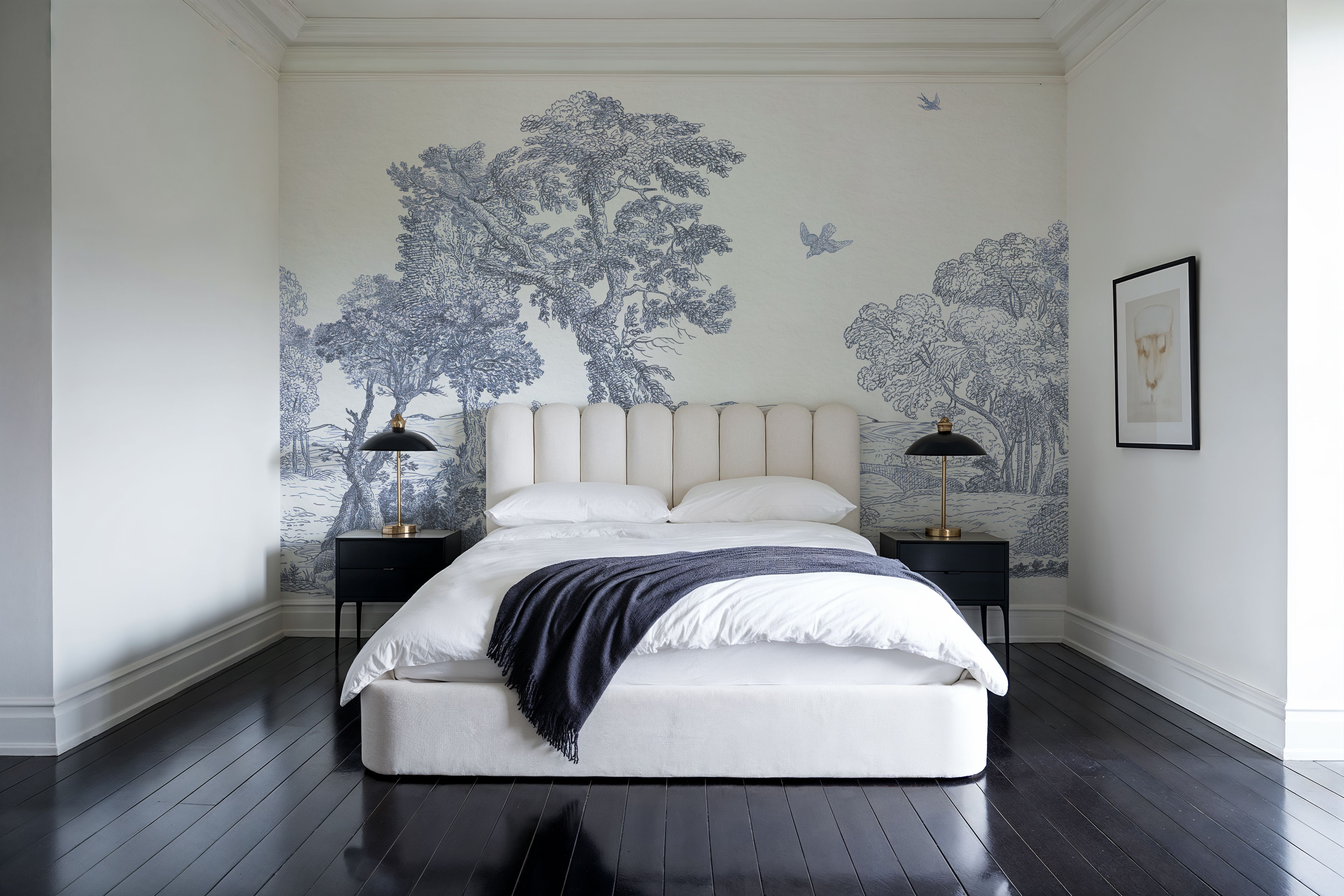 A large-scale design in a soft or limited palette can create a strong visual presence while still keeping the room airy. Abstract landscapes, linework, or painterly shapes bring subtle drama to a modern backdrop.