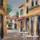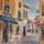 This wallpaper captures a quiet Parisian street with a charming patisserie under a bright red awning. White café chairs and small round tables with flowers add a romantic, nostalgic touch along the cobblestone walkway. Warm earthy tones and saffron-orange shades dominate the scene, softened by surrounding greenery and pastel buildings. In the distance, a calm river and arched bridge complete the dreamy atmosphere. Ideal for living rooms, kitchens, dining areas, or cafés, this artistic mural brings a tranquil and inviting mood to any space through its soft colours and nostalgic cityscape.