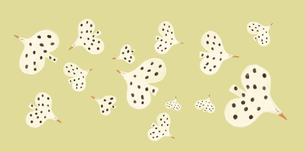 This wall mural features whimsical abstract birds against a light green backdrop. The cream-colored birds, adorned with black spots and orange beaks, create a playful scene. Their varying sizes and orientations evoke a sense of joyful movement. The simple, hand-drawn style and soft edges make it perfect for spaces like a kids room or nurseries, adding a touch of lightheartedness. Imagine this cheerful design transforming your play room into a vibrant, creative hub. The light color theme complements contemporary and minimalist interior styles. The olive green background offers a calming effect, making it a beautiful yet subtle addition to any home. This paint drawing style creates a unique focal point that's sure to delight. Embrace the abstract art birds and bring a bit of joy to your walls.